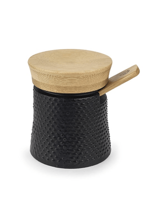 The bamboo storage base with its warm finish provides a unique showcase for these two magnificent cast-iron pieces: an 8 cm - 3 1/4 in pepper mill and a salt cellar with lid and a delicate bamboo spoon deliver the perfect dose of salt.