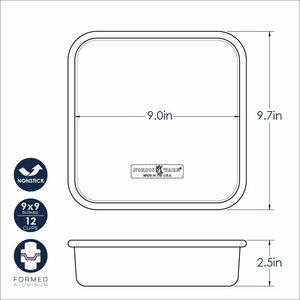 A necessity for any serious baker's kitchen, this Nonstick Naturals® Square Cake Pan provides the ultimate in cake-baking perfection. Made with a nonstick formed aluminum, this 9-inch by 9-inch pan provides an even baking surface and extremely easy cleanup. Proudly made in the USA.
